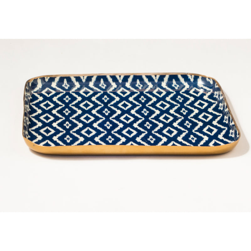 This Square shaped aluminium platter has a glossy enamel core with a mesmerizing Ikkat print that adds elegance to your table setting. It wears a coat of lacquer that meets international food safety standards. Paired with an aluminium dip bowl with, its ideal for serving snacks or passing nibbles at a party. Care: avoid from deep water soaks and hard cleaning chemicals.