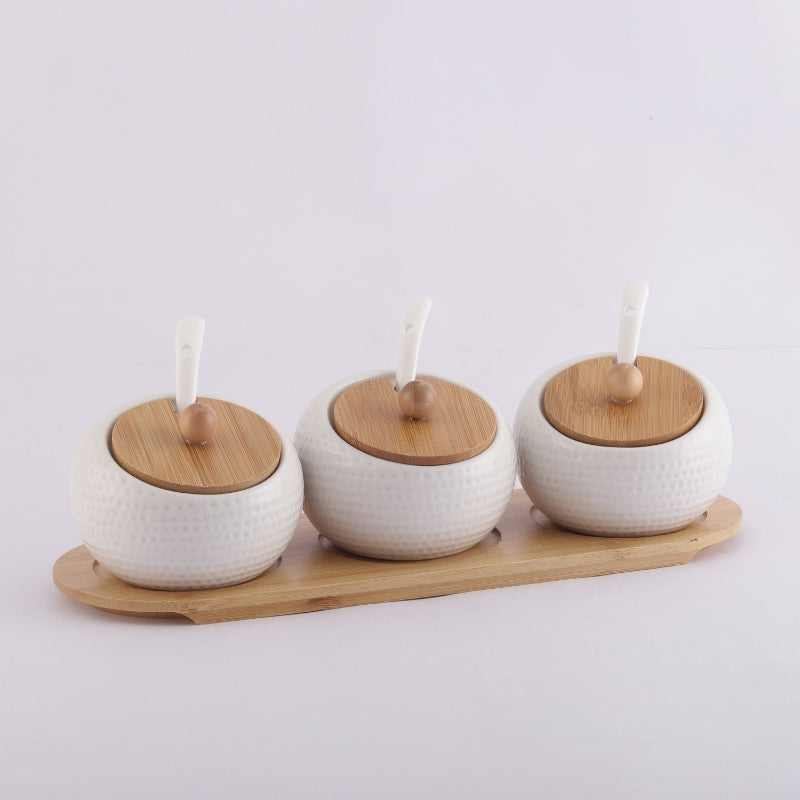This Beautifully designed Ceramic textured appearance will complement any home decor. Space Saving Flat Back sits Set includes 3 ceramic jars, 3 ceramic serving spoons and a wooden stand