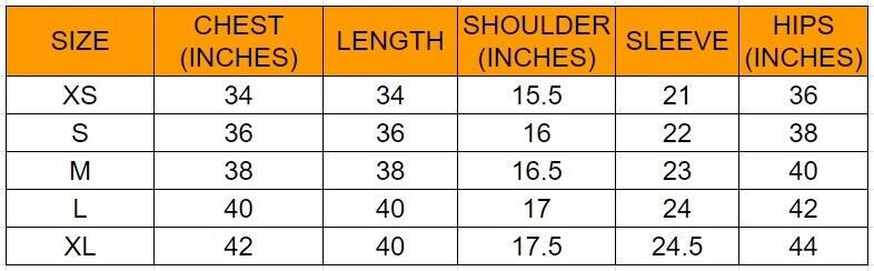 Size :- XS(Chest Size-34), S(Chest Size-36), M (Chest Size-38), L (Chest Size-40), XL (Chest Size-42)