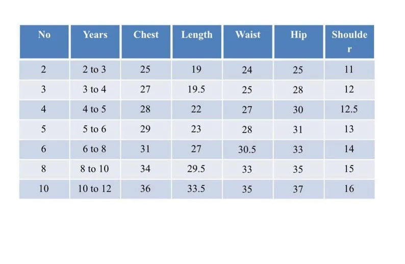 Kid's Size :- 2 (2-3 Years), 3 (3-4 Years), 4 (4-5 Years), 5 (5-6 Years), 6 (6-8 Years), 8 (8-10 Years), 10 (10-12 Years)